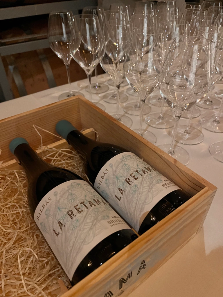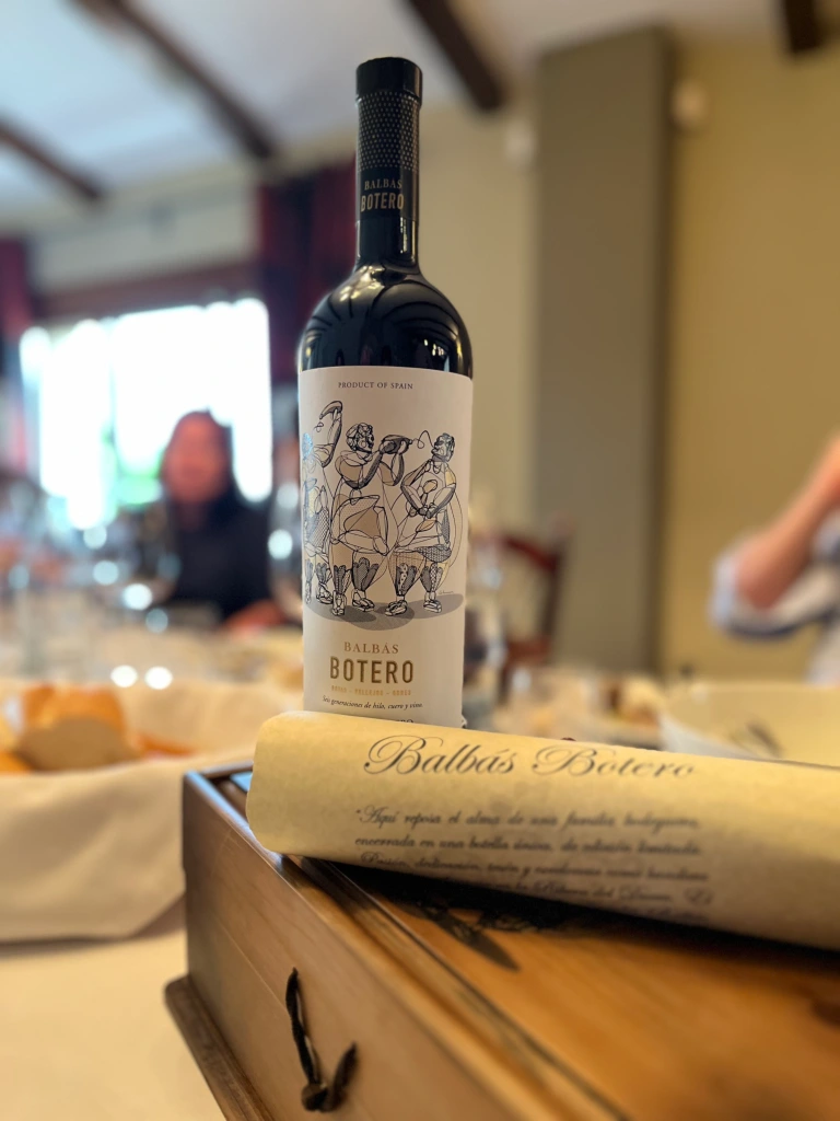Ya en la comida, en el final de la visita, tuvimos la suerte de catar Botero. Este gran vino se hace con uvas de las viñas del término de Santa Eulalia, ubicado en La Horra, que tienen unos 120 años y proceden de muchos clones distintos de Tempranillo. Es un vino poderoso y robusto. De los de larga sobremesa e interesantes conversaciones. Su etiqueta está dedicada al hilo con el que se cosen las botas para transportar vino, y es que terminamos la visita evocando el inicio de todo: el oficio de botero que dio origen a la bonita consagración de la familia Balbás al mundo del buen vino.