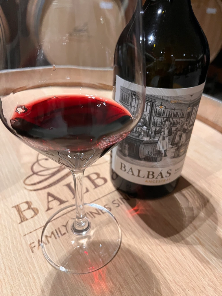 El segundo vino catado fue Ancestral. Juan José confesó que es un capricho de la familia y explicó que se elabora como se hacían los vinos antes. La etiqueta es un rediseño del primer vino que se embotelló en Balbás e incluso la botella tiene la forma tradicional española, como la primera que se utilizó. Es un perfecto continente para un vino carnoso, con nervio, muy fresco y que muestra abundantes notas de mineralidad. Es el favorito de Pedro, que se declara un romántico pero que a la vez sabe valorar la originalidad de este vino.